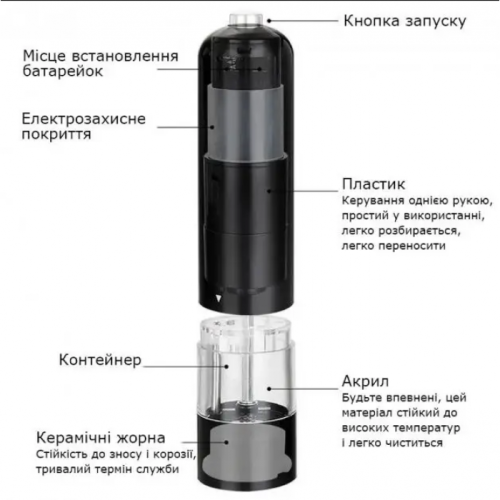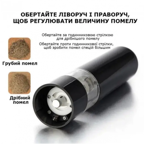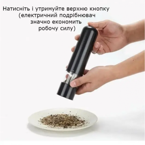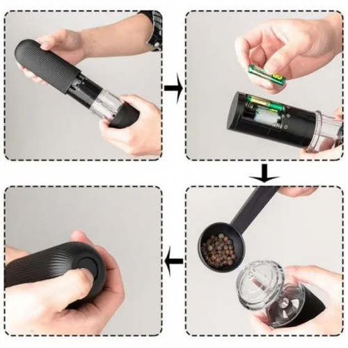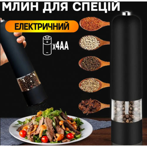 Электрическая мельница для специй станет неотъемлемой частью для вашего дома и вашей кухни. Свежемолотые ароматные приправы буквально вдохнут новую жизнь в вашу домашнюю еду. А процесс помола возьмет на себя незаменимый кухонный помощник – электрическая мельница для соли и перца. Быстро измельчить перец, семена, зерна кофе можно с помощью электрической мельницы для перца. Изделие работает от 4 батареек АА. Оснащено светодиодной подсветкой, которая кроме эстетического предназначения имеет и вполне практическую: вы хорошо будете видеть количество перца, даже в темное время суток.