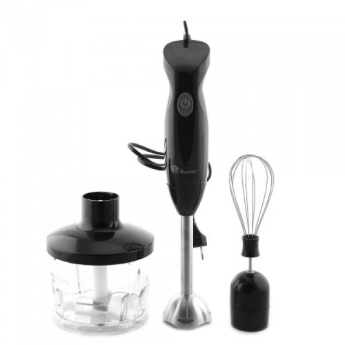 Комплектация этого блендера включает в себя всё самое необходимое для приятного использования устройства. Здесь имеется и чаша для того, чтобы измельчать фрукты, овощи и другие продукты. Кроме неё, также входит пластиковый стакан, идеально подходящий для взбивания коктейлей и смузи. Измельчитель сама насадка, венчик и насадка для взбивания пюре, выполнены из нержавеющей стали, что гарантирует их длительное служение. А вот переходники и рукоятка блендера сделаны из пластика.