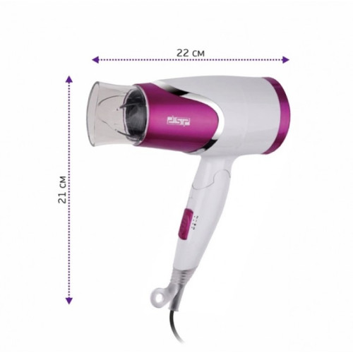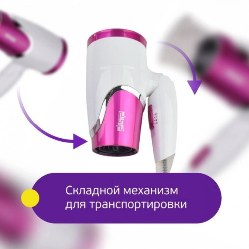 Главным преимуществом этой модели 30077 портативного фена от компании DSP является компактность, мощность и надежность. Размеры фена позволят с легкостью разместить его в дорожной сумке, благодаря небольшому размеру и складной ручке. Он просто незаменим в путешествиях!