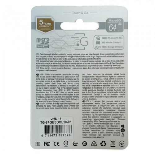 памяти Touch & Go 64 GB Micro SD TG-64GB UHS-1 имеет скорости Class 10 UHS-1