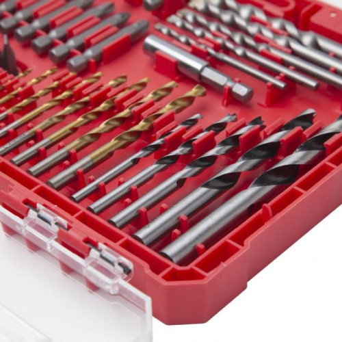 Сверла и насадки размещены в удобном и прочном пластиковом кейсе с замками. Каждый элемент прочно закреплен в плотной ячейке, что препятствует произвольному выпадению инструмента. Позволяет комфортно переносить и хранить весь набор.