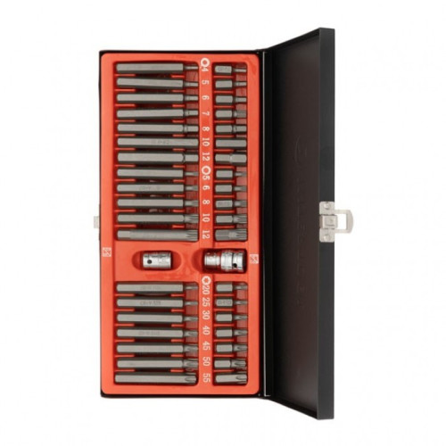 Весь набор помещен в прочный металлический кейс, который закрывается защелку из металла. Удобно транспортировать и хранить набор, все насадки размещены в персональных пронумерованных ячейках - вы быстро найдете необходимую биту.