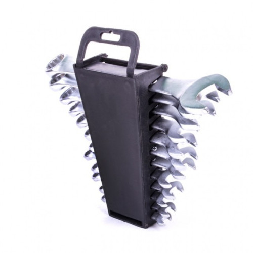 INTERTOOL HT-1203 — это набор из 12 комбинированных ключей, каждый из которых представляет собой сочетание рожкового и накидного гаечного ключа. Размерная линейка набора — от 6 до 22 мм. Обе стороны ключей имеют одинаковый размер головки. Рожковая сторона ключей является самой популярной среди соединений и имеет обширную область применения. Накидная сторона ключей, благодаря кольцевому строению, в момент приложения усилия позволяет распределить нагрузку равномерно. Это снижает риск «слизать» грань угла. В целом, они обширно применяются в автослесарном деле. Ключи изготовлены из хром-ванадиевой стали. Её физические и химические свойства обуславливают высокую устойчивость к механическим нагрузкам, коррозионную стойкость и твердость. Кроме того, эта легированная сталь обладает благоприятным модулем упругости. Удобная форма ключа обеспечивает оптимальные условия для приложения усилия. Ключи поставляются в удобном пластиковом держателе с ручкой и отверстием для подвешивания.