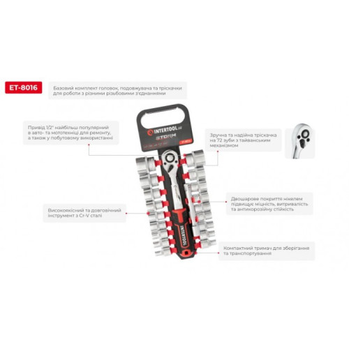 Набор головок 1/2" 8-32 мм, удлинитель, 72 зубца, 20 ед., Cr-V STORM INTERTOOL ET-8016