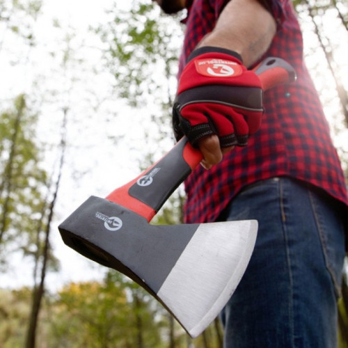 Топор компактного размера, поэтому легко помещается в багажник машины. Силиконовая накладка на лезвие защищает от случайных порезов и повреждений. Красно-черный окрас топора помогает быстро его находить глазами, даже в густом лесу или в траве.
