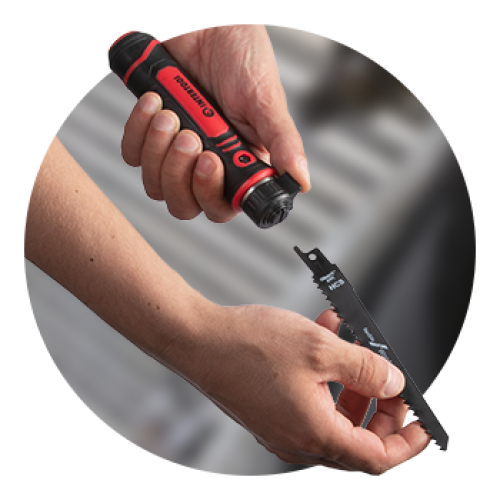 Двухкомпонентная рукоятка эргономичной формы удобно лежит в руке и не проскальзывает при интенсивной работе благодаря прорезиненному покрытию. Также на рукоятке расположен быстрозажимной патрон, который позволяет заменить полотно без использования сторонних инструментов одним поворотом рычага фиксатора.