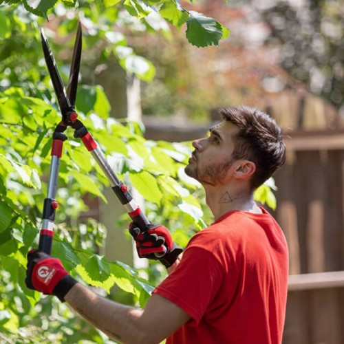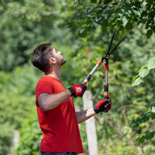 Телескопические рукоятки садовых ножниц выполнены из прочного алюминия, легкие и надежные. Нажав на фиксатор Вы легко подберете необходимую рабочую длину инструмента. Благодаря небольшому весу кусторезом комфортно работать даже на большой высоте.
