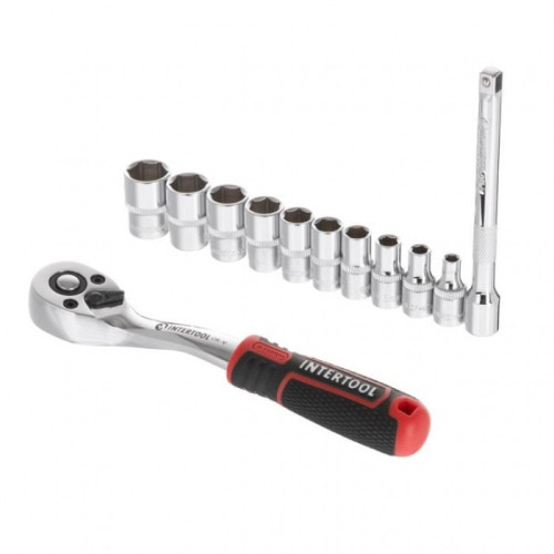 Набор головок 1/4" 4-13 мм., удлинитель, рукоятка с храповым механизмом 72 зуба, 12ед., Cr-V STORM INTERTOOL ET-8012