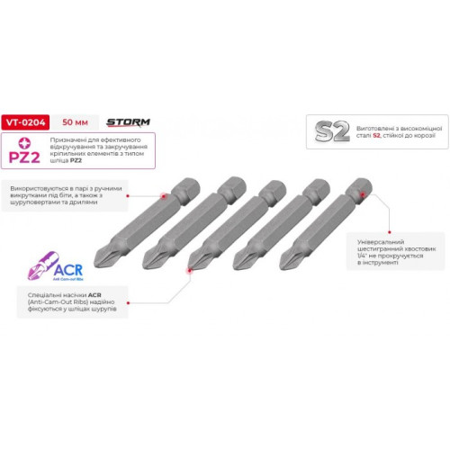 Комплект отверточных насадок PZ2 1/4"*50мм, ACR, S2, уп. 5ед., STORM INTERTOOL VT-0204
