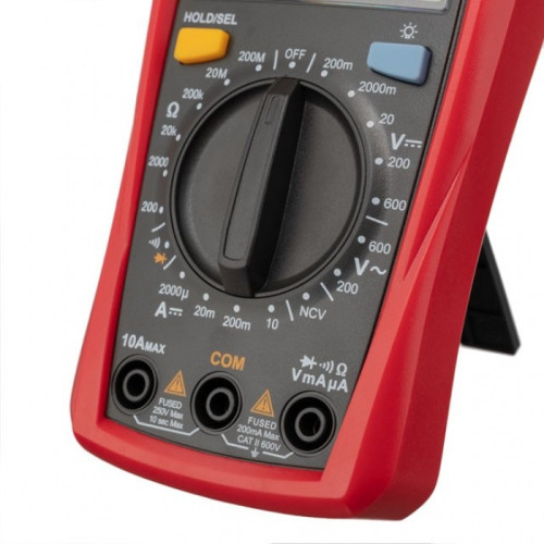 Легкий и компактный корпус мультиметра изготовлен из прочного и надежного пластика. Прорезиненный чехол по периметру корпуса не скользит в руках и защищает от механических повреждений. Подставка (откидываемая ножка) на задней части легко открывается и позволяет установить прибор в удобном положении.
