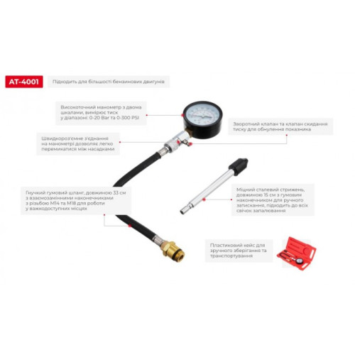 Устройство измеряет давление в конце такта сжатия в цилиндрах, что позволяет оценить состояние поршневой и клапанной группы двигателей. Прочные элементы компрессометра обеспечивают надежное удержание давления.