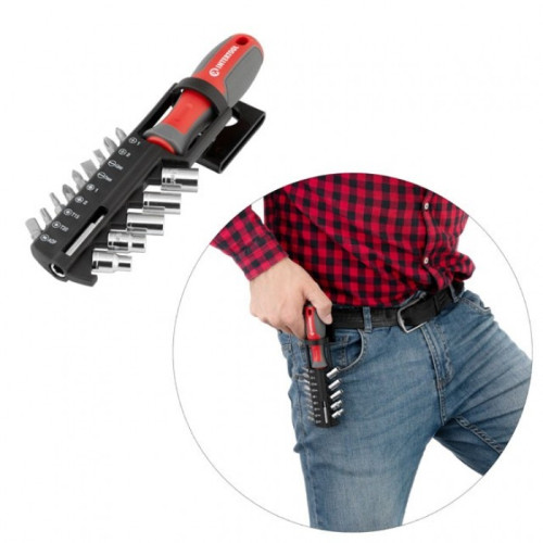 Весь набор помещен в компактный держатель с возможностью крепления на поясе. Биты и головки размещаются на индивидуальных посадочных местах, и не выпадают. Вы быстро найдете необходимую насадку, благодаря нанесенной маркировке.