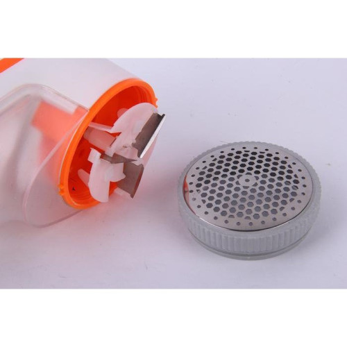 Принцип работы машинки для удаления катышков прост: при прикосновении головки прибора с тканью, имеющиеся на ткани сбившиеся волокна попадают в отверстия сеточки и срезаются находящимися за ней острыми лезвиями. Лезвия вращаются по кругу по принципу вентилятора. При таком вращении создается поток воздуха, который втягивает срезанные волокна внутрь устройства. В результате, они попадают в специальный контейнер, находящийся на корпусе прибора. Контейнер сделан из прозрачного пластика, поэтому вы всегда будете видеть, насколько он наполнен отходами. Если контейнер заполнен на 80%, машинка от катышков подлежит чистке. Для этого контейнер нужно снять и высыпать его содержимое в мусорное ведро.