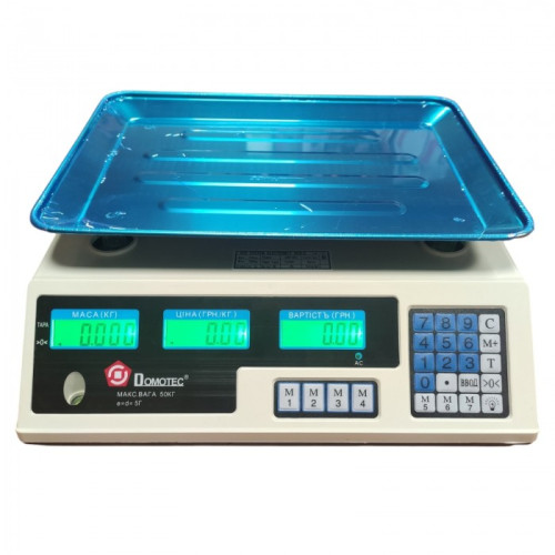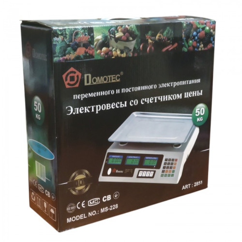 Весы электронные, торговые Domotec MS-228 с калькулятором – предназначены для взвешивания товара в магазинах и различных торговых точках. Корпус весов изготовлен из пластика, платформа изготовлена тоже из пластика. Устройство имеет два дисплея отображения полной информации по товару, для продавца и покупателя.