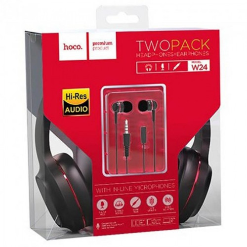 Комплект проводных наушников накладные + вакуумные Hoco W24 Чёрные с красным