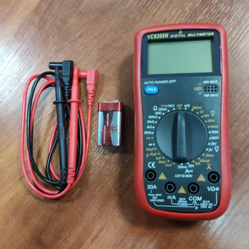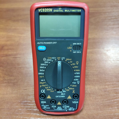 VC9205N - мультиметр цифровой, предназначен для измерения переменного (AC до 750В) и постоянного (DC до 1000В) напряжений, переменного и постоянного тока (до 20А), сопротивления (до 200 Ом), ёмкости (до 200 мкФ), а также измерения параметров диодов и транзисторов, проверки целостности цепи (со звуковой и световой сигнализацией).