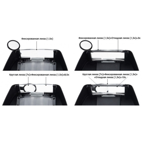 Кратность увеличительных стекол регулируется от 1.5х до 10х путем последовательных комбинаций: