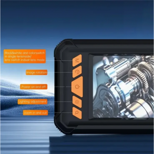 Для удобства использования в местах с недостаточной освещенностью на конце оптического зонда расположены 8 белых светодиодов LED. Максимально разрешение съемки от установленной 2.0 MP камеры составляет 1920x1080 пикселей. Качество камеры позволяет видеть максимально сфокусированное и качественное изображение на расстоянии от 4 до 500 см. Эндоскоп функционально можно разделить на 2 части – камеру на гибком шлейфе и приемник-экран. Приемник имеет прямоугольную форму корпуса, а сам корпус изготовлен из прочного пластика. Камера не подключена к приемнику. На передней стороне приемника расположен цветной экран размером 4.3 дюйма, а также пять функциональных кнопок.